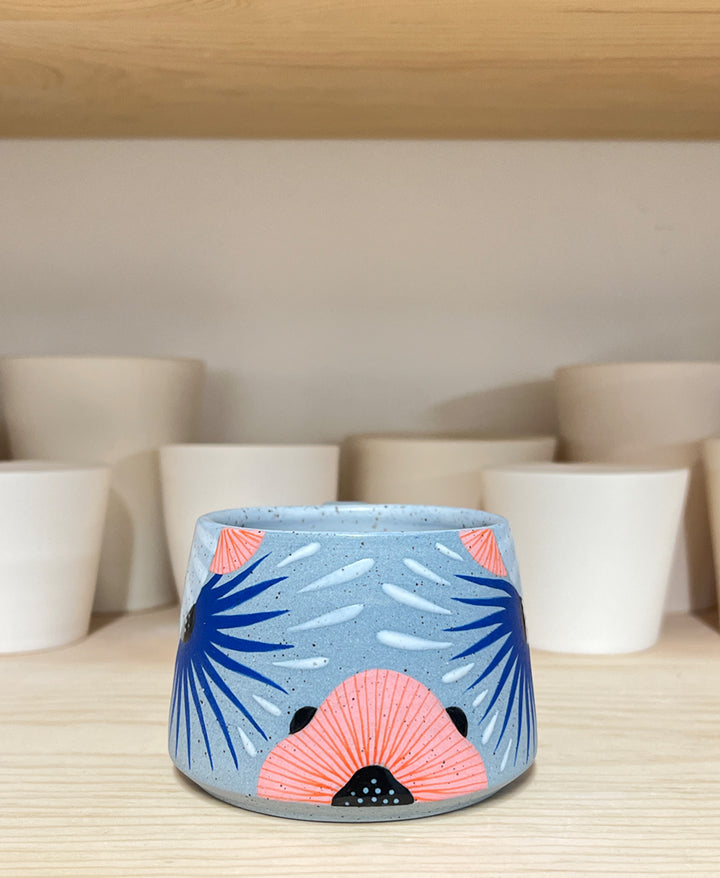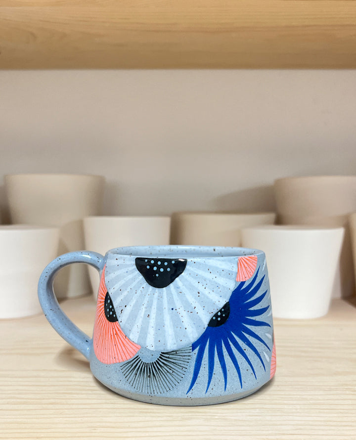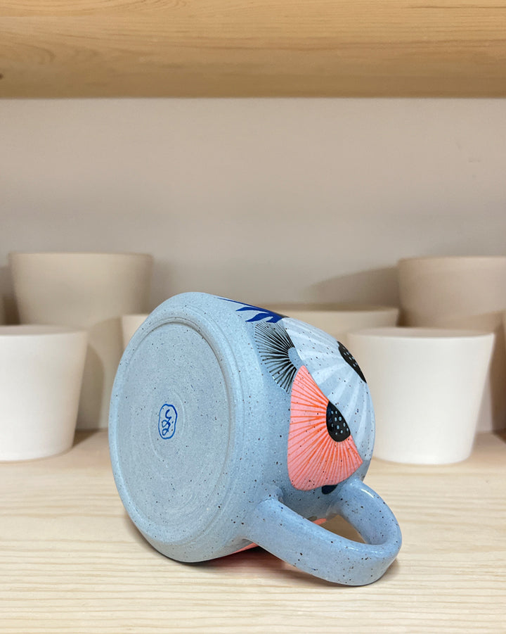 This stoneware mug is hand-thrown on the wheel and hand-decorated using food-safe glazes. Measures approximately 3.75" wide x 2.5" tall and holds approximately 8 oz.