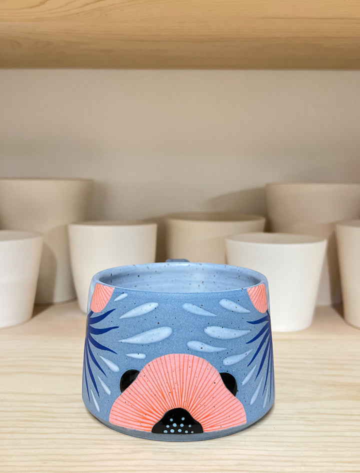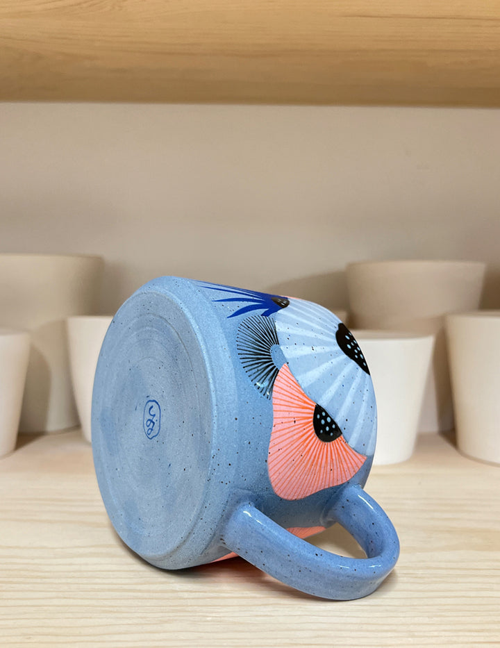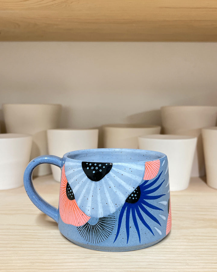 This stoneware mug is hand-thrown on the wheel and hand-decorated using food-safe glazes. Measures approximately 4" wide x 2 5/8" tall and holds approximately 11 oz.