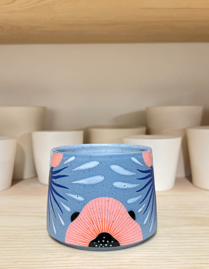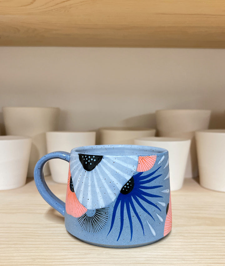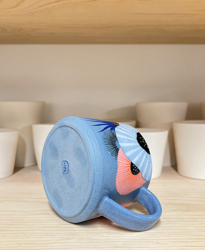 This stoneware mug is hand-thrown on the wheel and hand-decorated using food-safe glazes. Measures approximately 3 3/4" wide x 2 7/8" tall and holds approximately 11 oz.