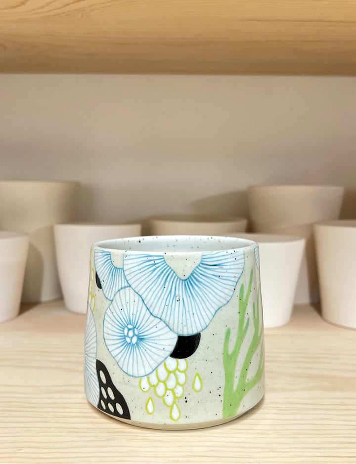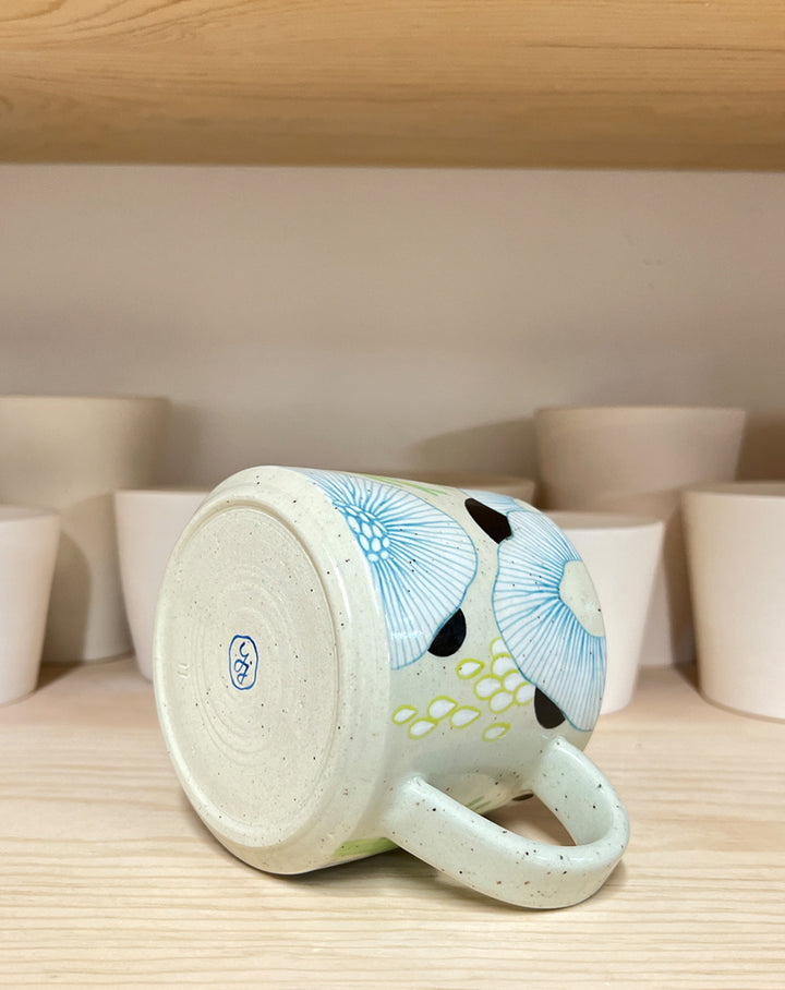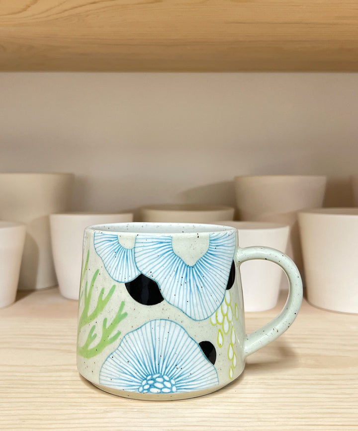 This stoneware mug is hand-thrown on the wheel and hand-decorated using food-safe glazes. Measures approximately 3.75" wide x 3.25" tall and holds approximately 13 oz.