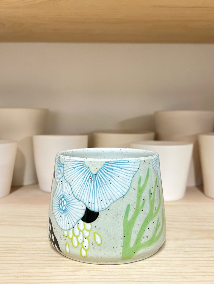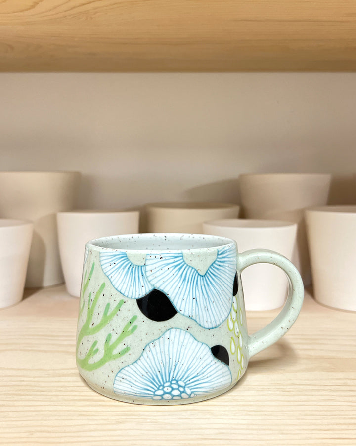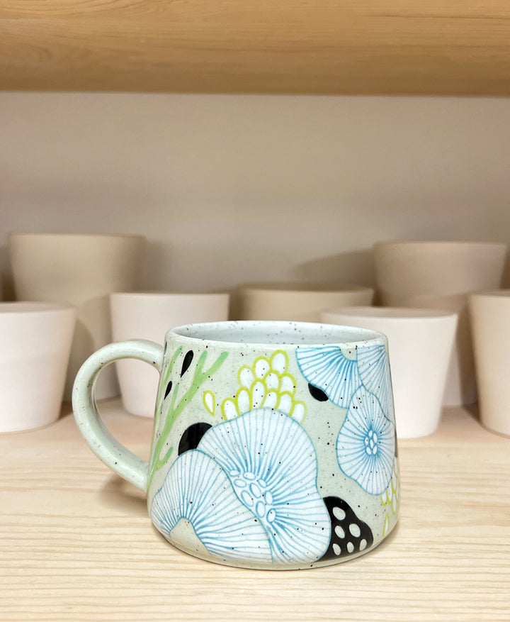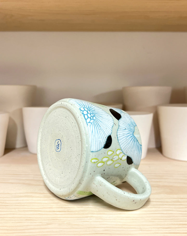 This stoneware mug is hand-thrown on the wheel and hand-decorated using food-safe glazes. Measures approximately 3 3/4" wide x 2 7/8" tall and holds approximately 11 oz.
