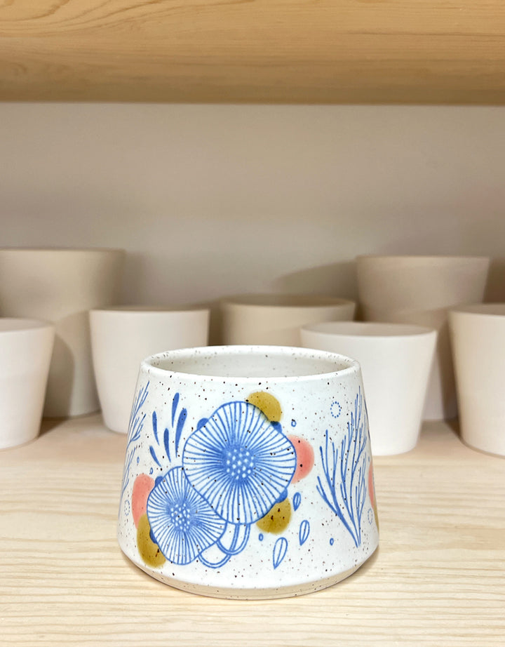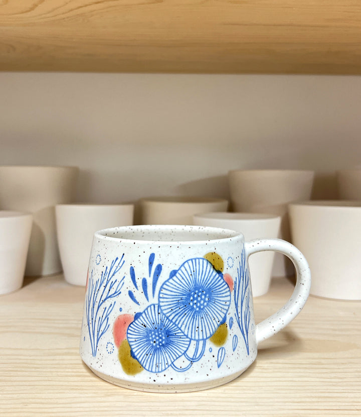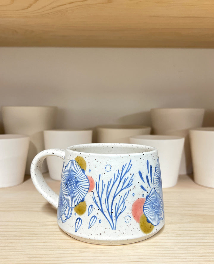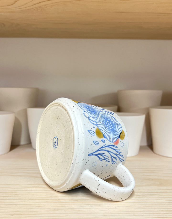 This stoneware mug is hand-thrown on the wheel and hand-decorated using food-safe glazes. Measures approximately 4" wide x 2 7/8" tall and holds approximately 12 oz.