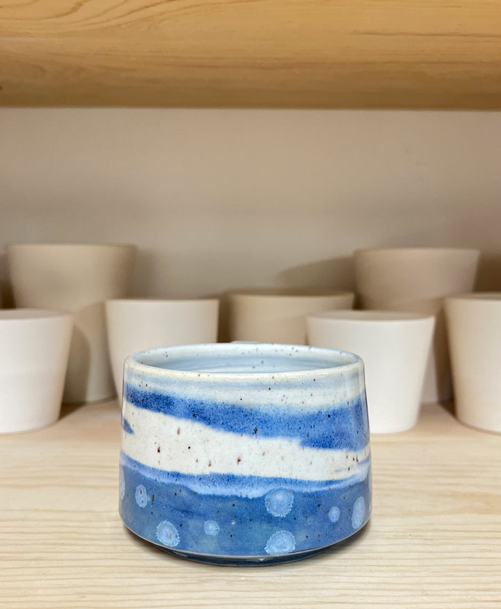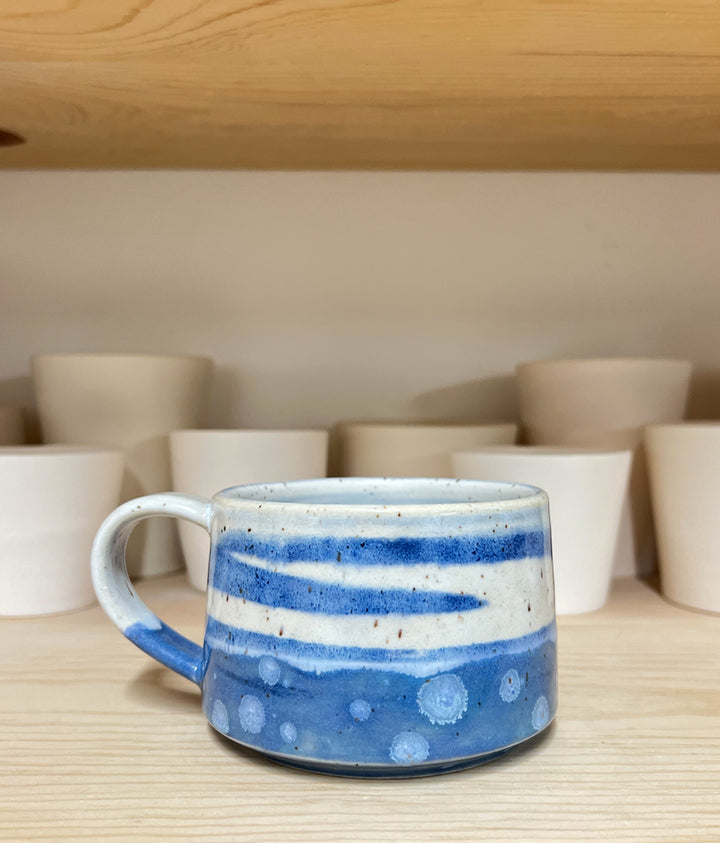 This speckled stoneware mug is hand-thrown on the wheel and hand-decorated using food-safe glazes. Measures approximately 3 7/8" wide x 2.5" tall and holds approximately 10 oz.