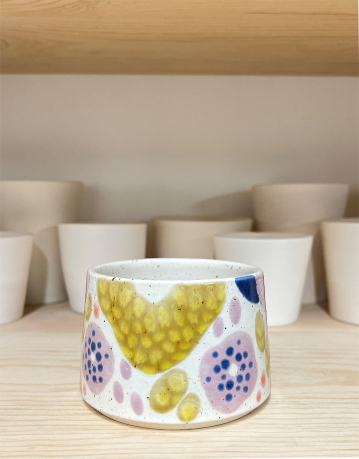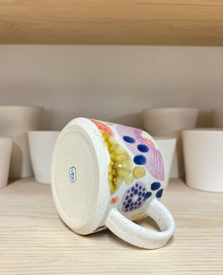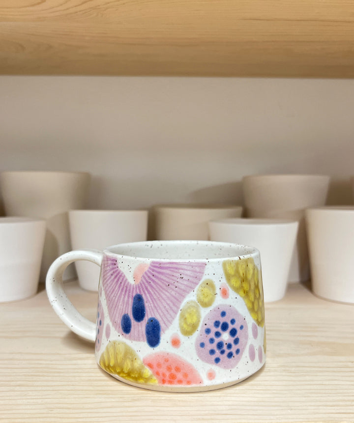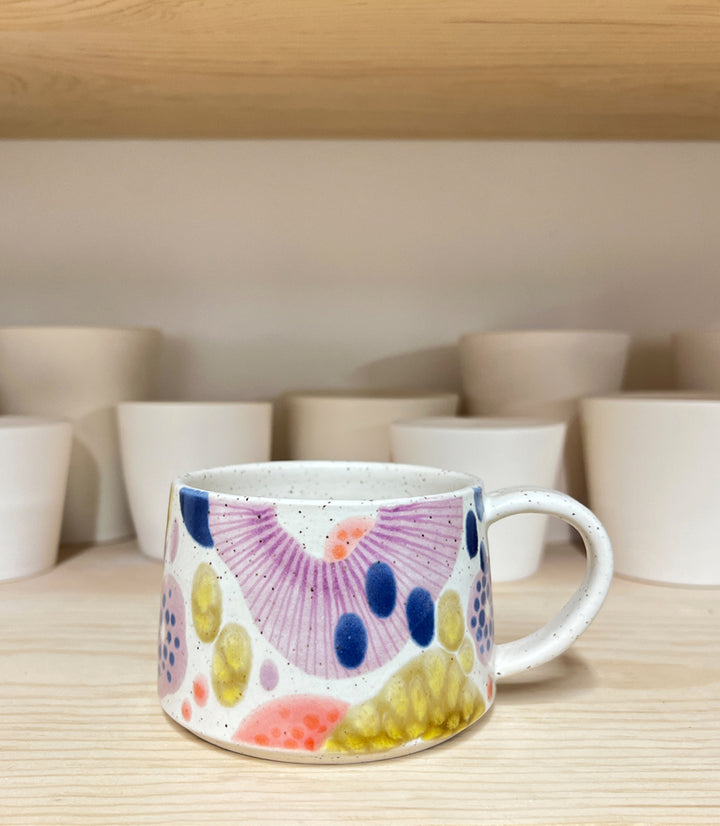 This stoneware mug is hand-thrown on the wheel and hand-decorated using food-safe glazes. Measures approximately 3.75" wide x 2.5" tall and holds approximately 10 oz.