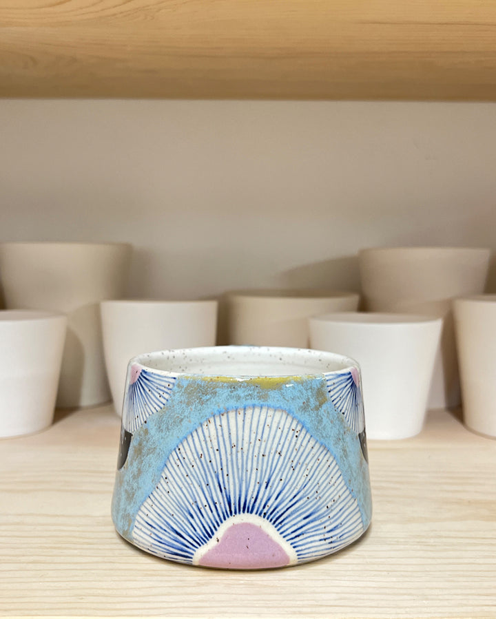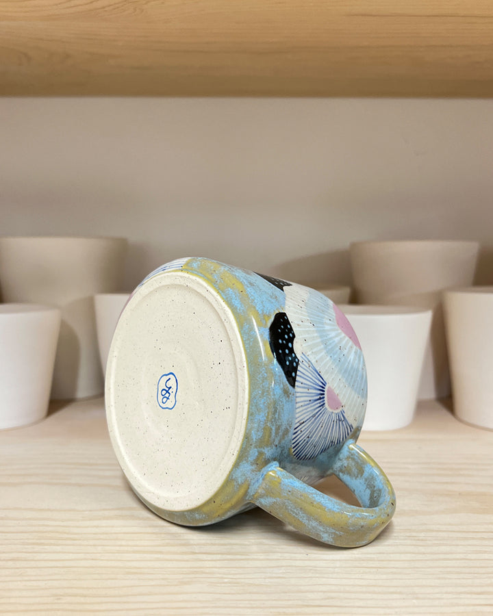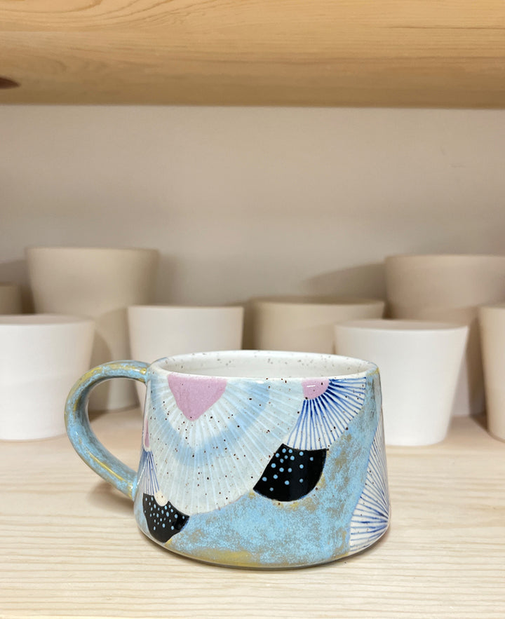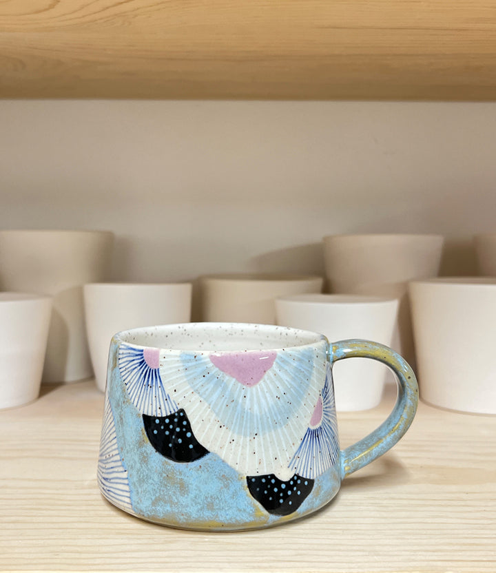 This stoneware mug is hand-thrown on the wheel and hand-decorated using food-safe glazes. Measures approximately 4" wide x 2.5" tall and holds approximately 11 oz.