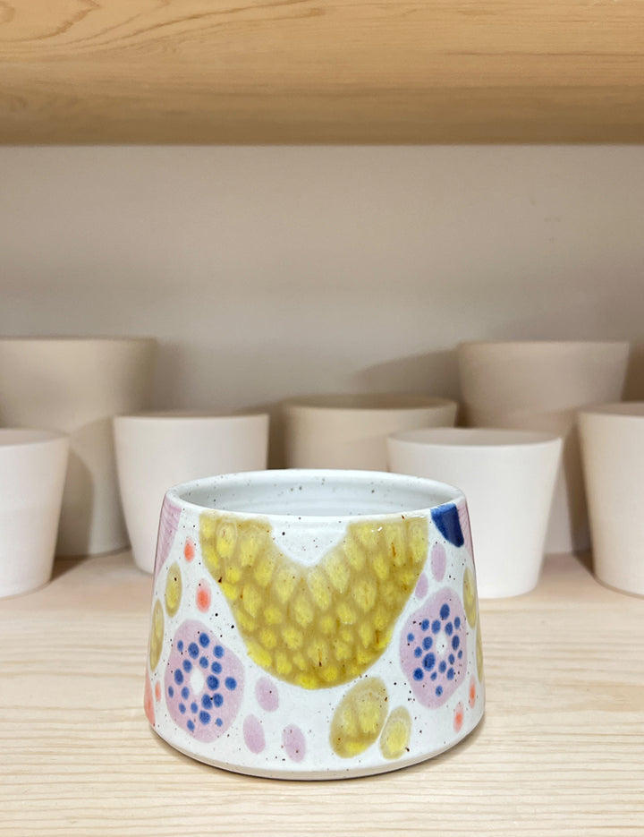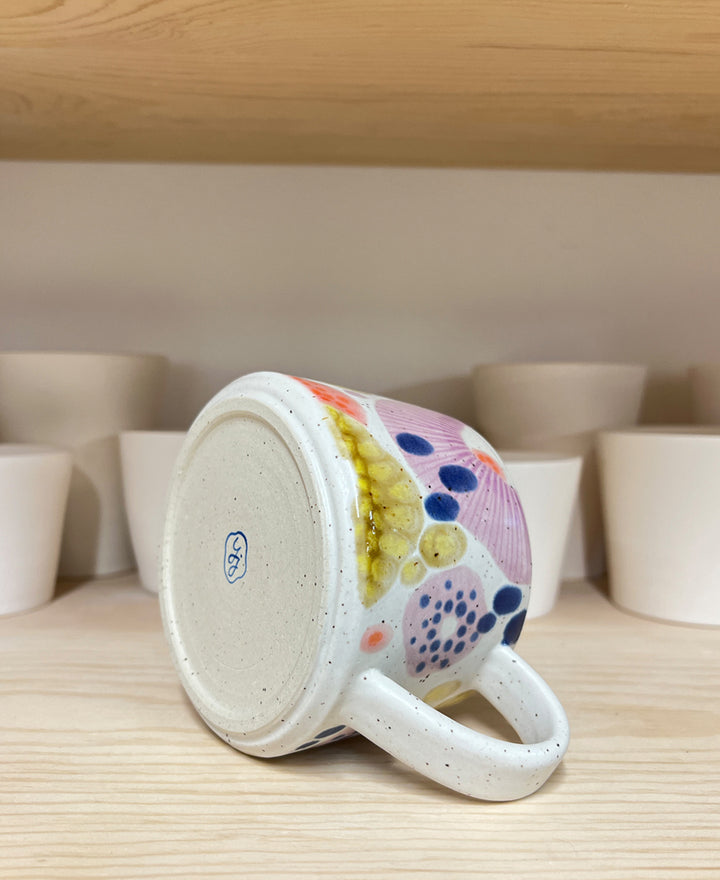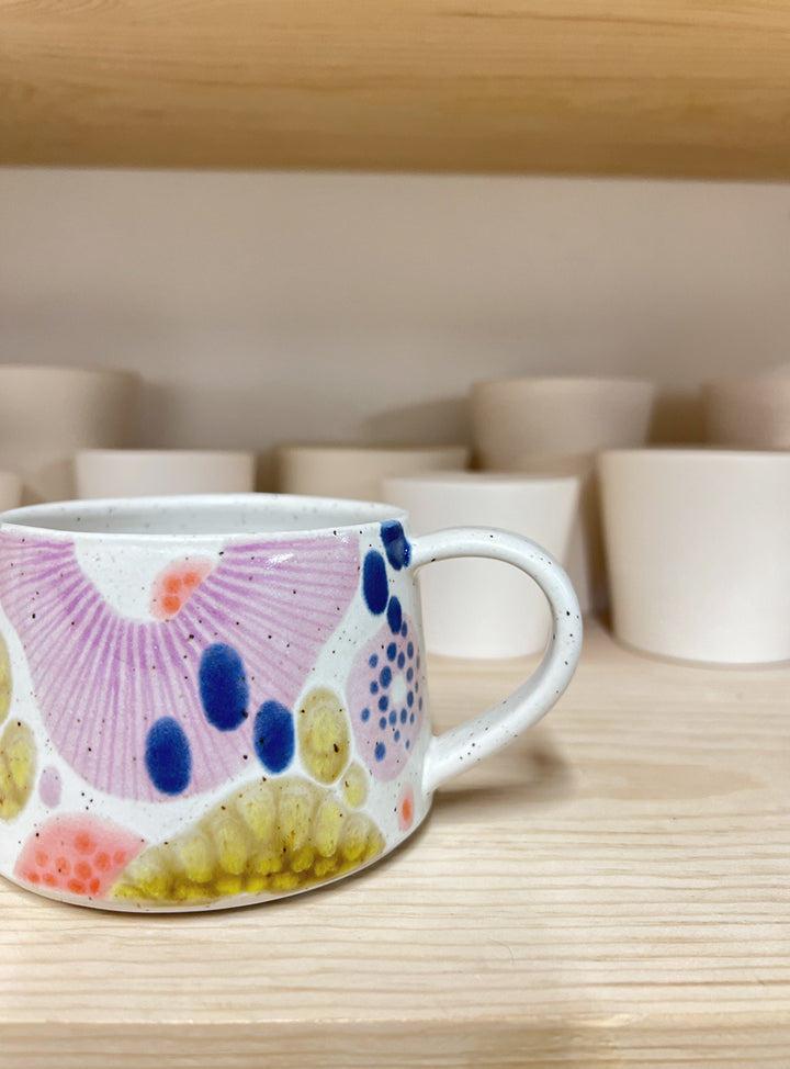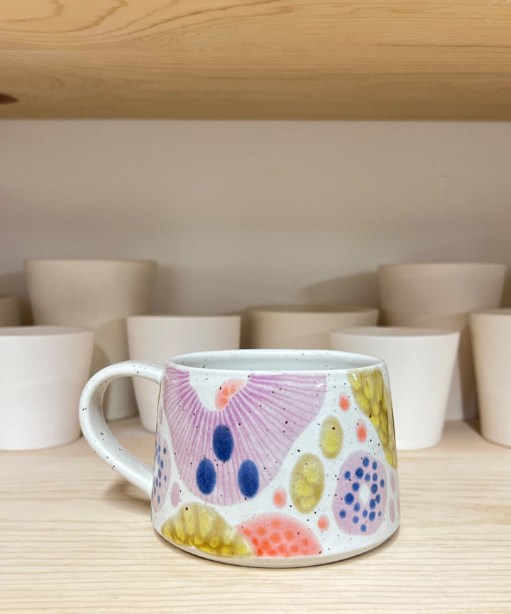 This stoneware mug is hand-thrown on the wheel and hand-decorated using food-safe glazes. Measures approximately 4" wide x 2.75" tall and holds approximately 12 oz.