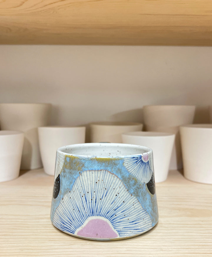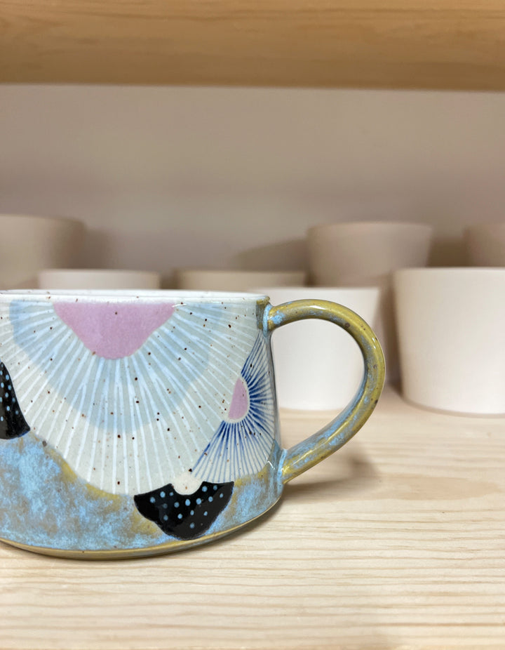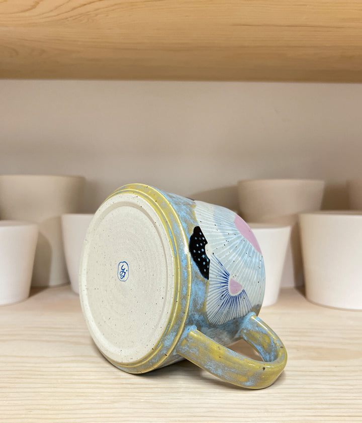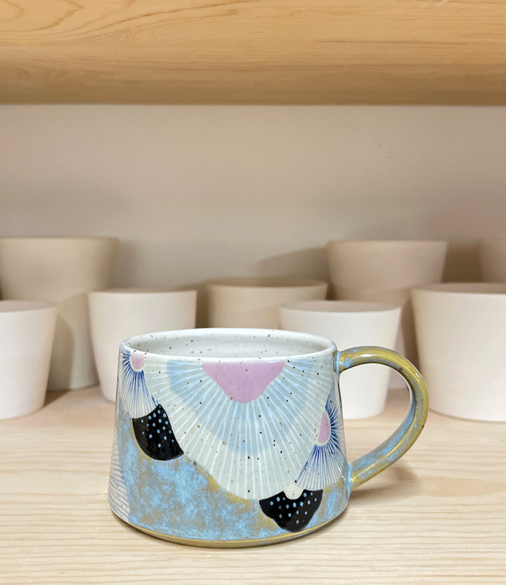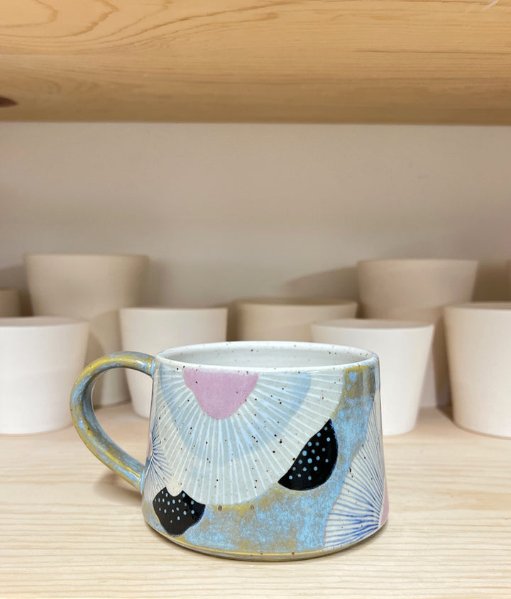 This stoneware mug is hand-thrown on the wheel and hand-decorated using food-safe glazes. Measures approximately 4" wide x 2.75" tall and holds approximately 12 oz.