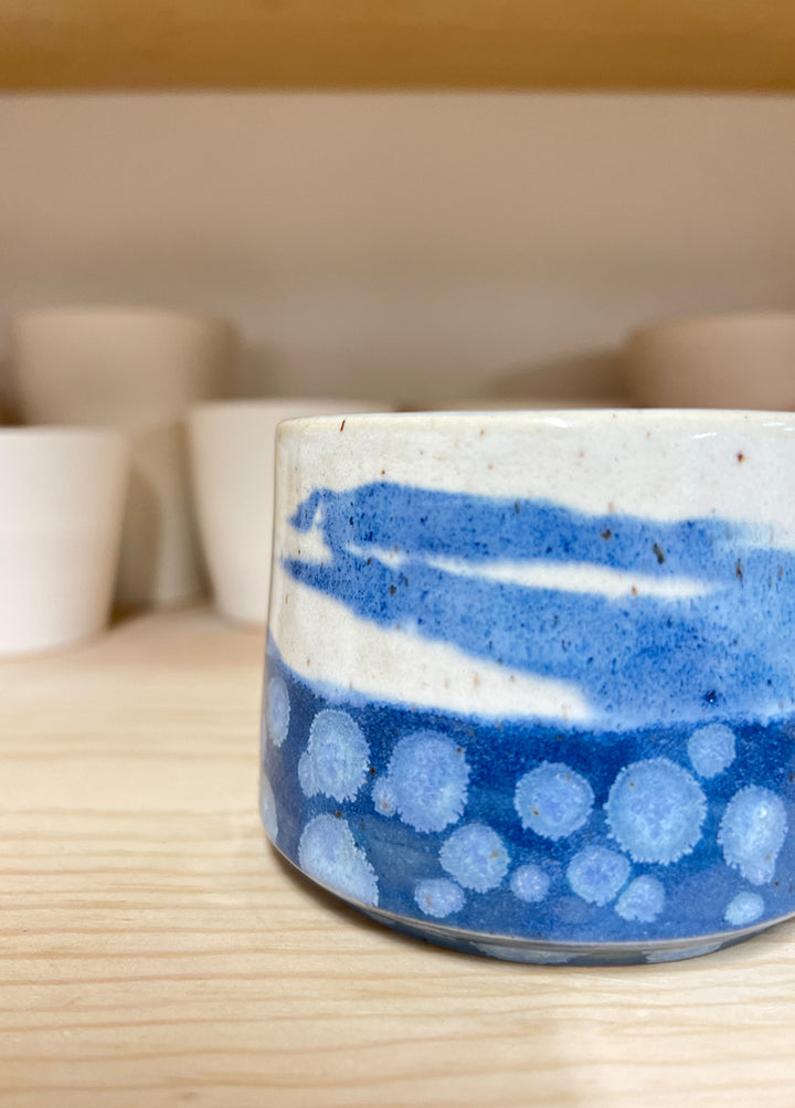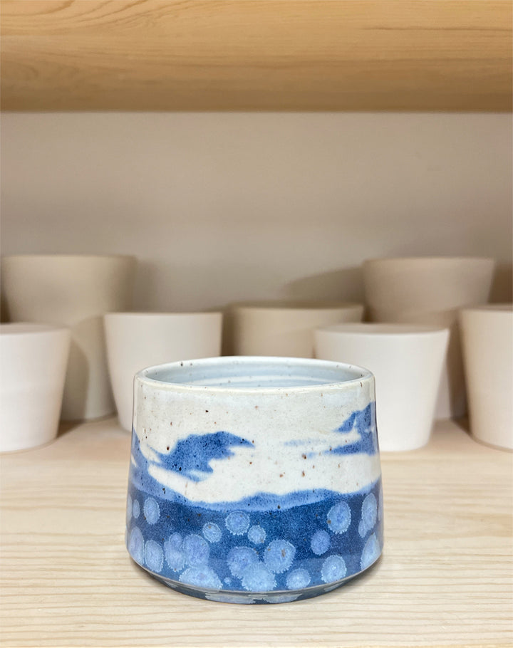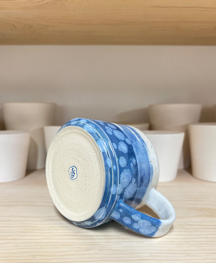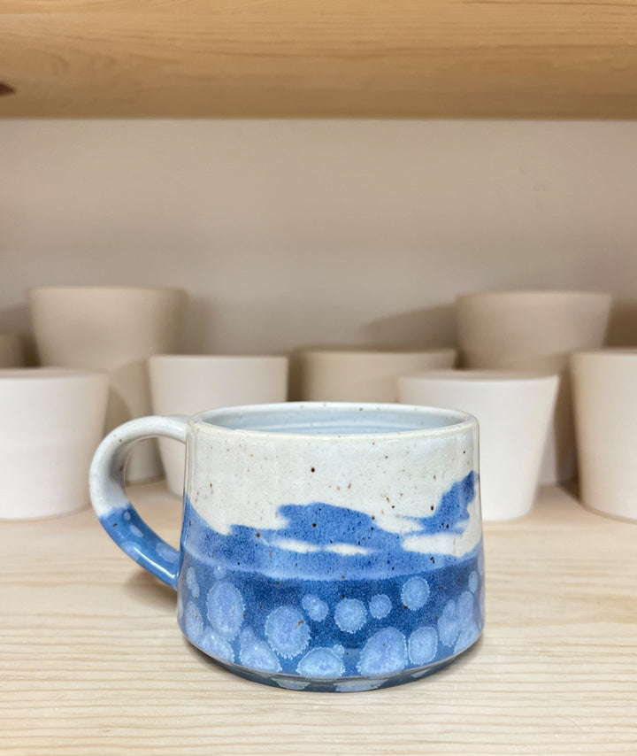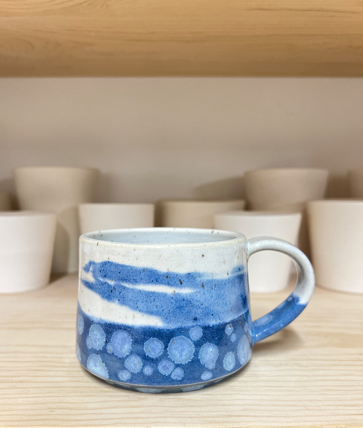 This speckled stoneware mug is hand-thrown on the wheel and hand-decorated using food-safe glazes. Measures approximately 3.75" wide x 2.75" tall and holds approximately 9 oz.