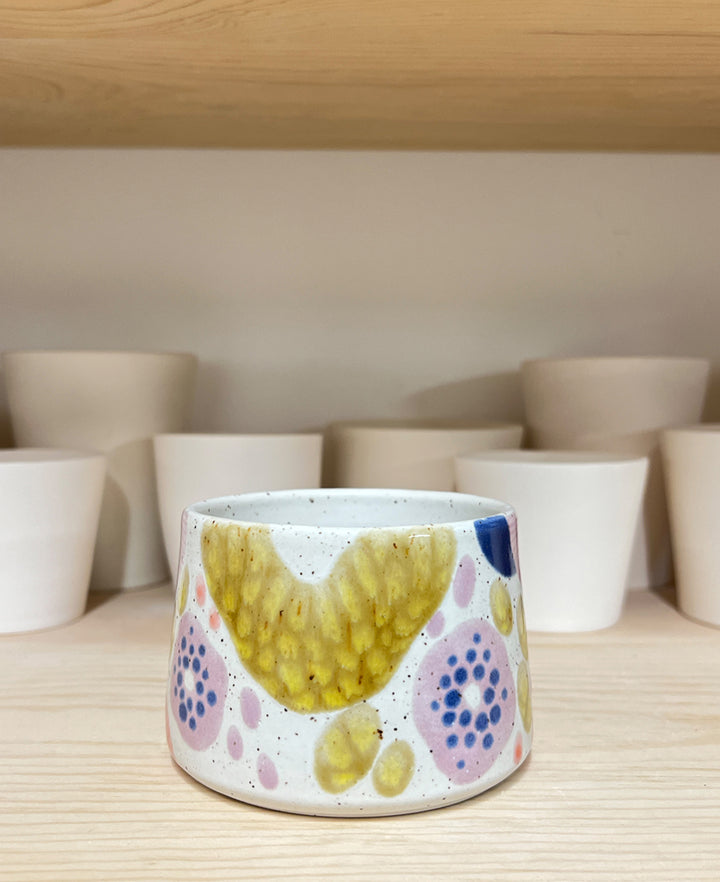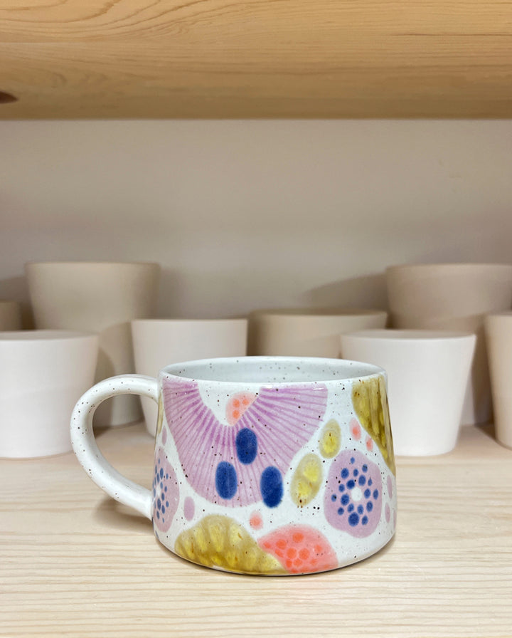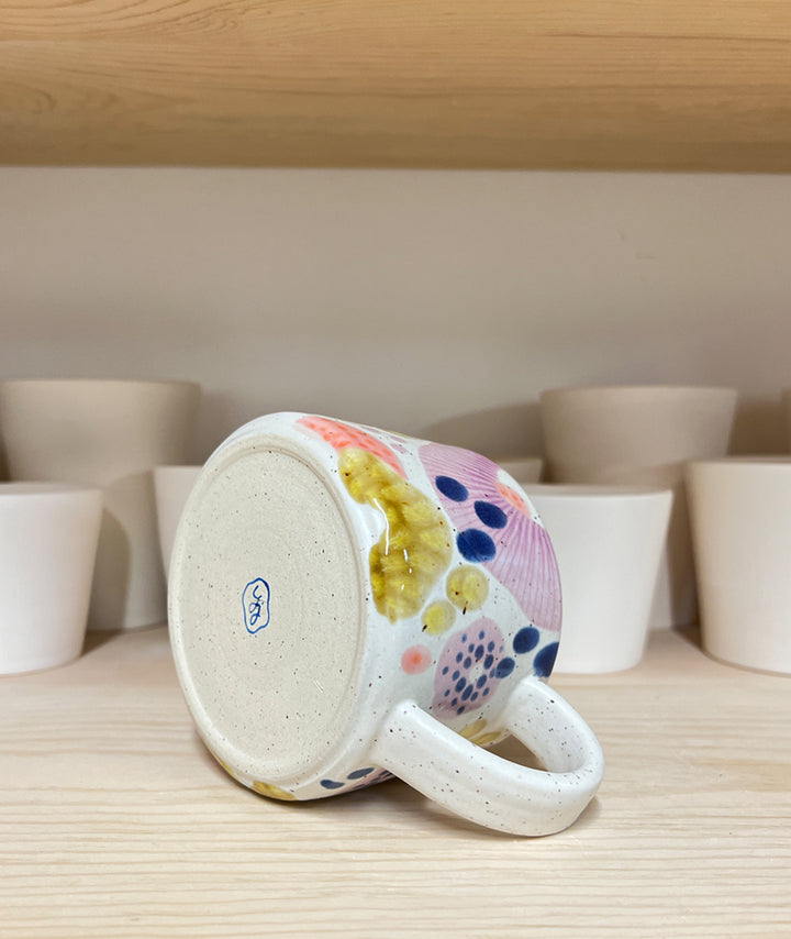 This stoneware mug is hand-thrown on the wheel and hand-decorated using food-safe glazes. Measures approximately 3.75" wide x 2.75" tall and holds approximately 11-12 oz.
