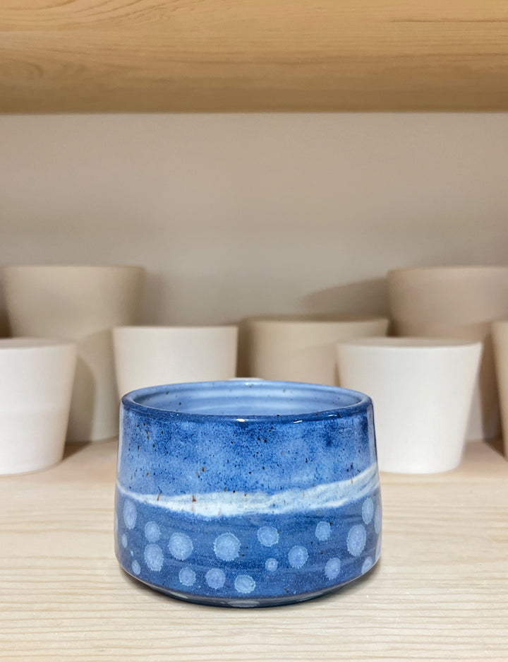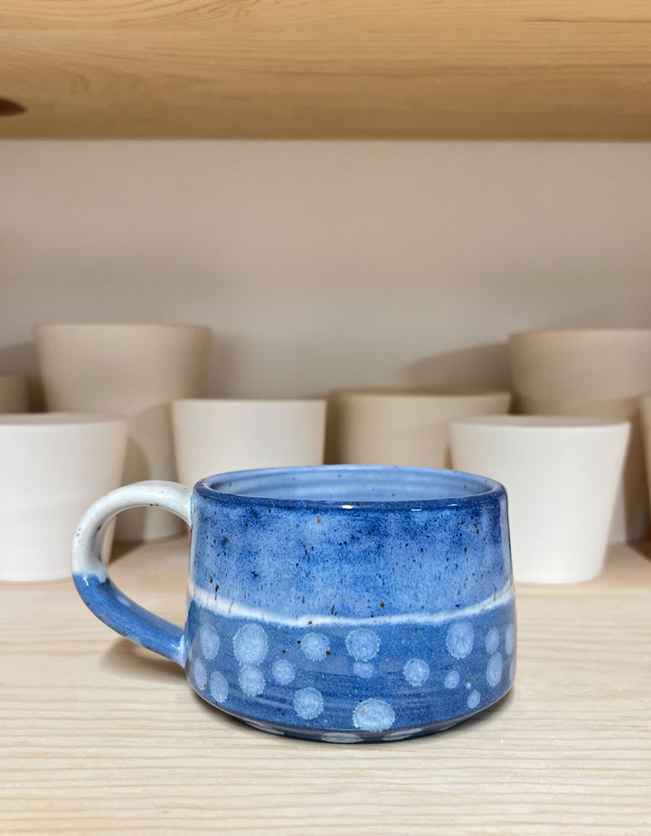 This stoneware mug is hand-thrown on the wheel and hand-decorated using food-safe glazes. Measures approximately 3 3/4" wide x 2 3/8" tall and holds approximately 10 oz.