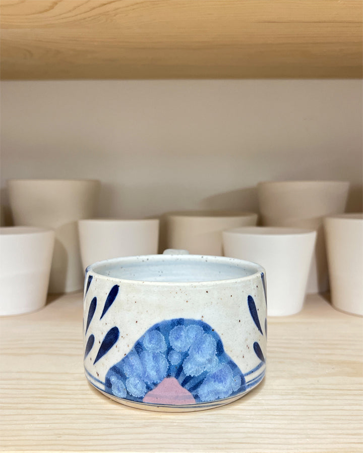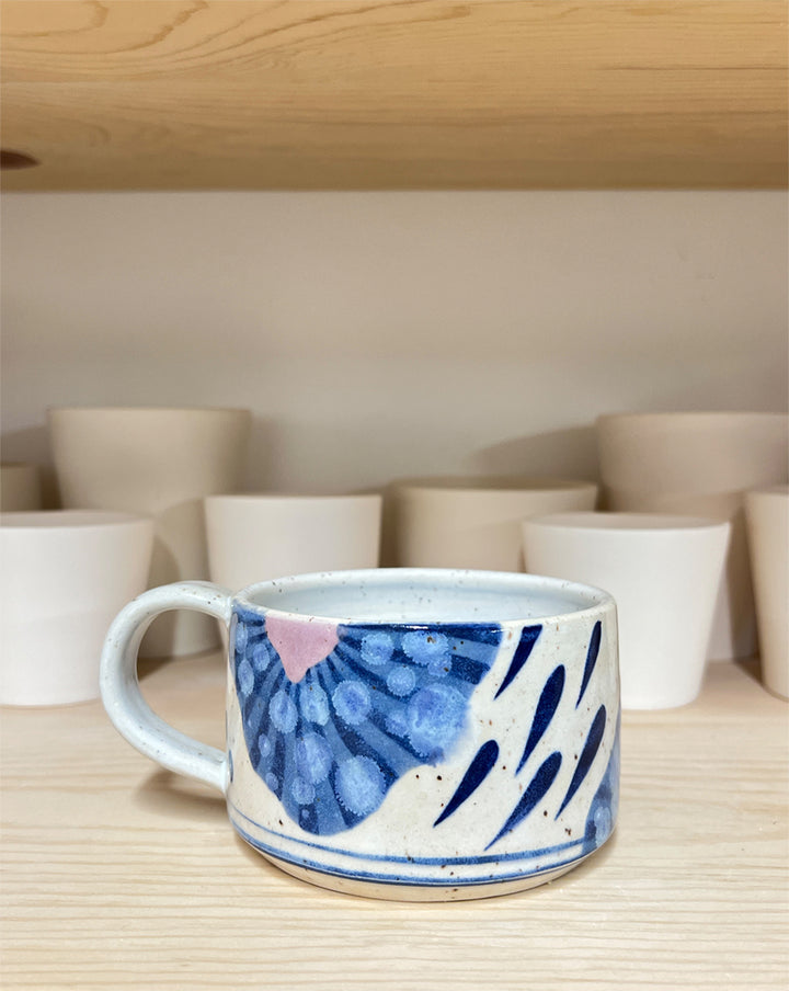 This speckled stoneware mug is hand-thrown on the wheel and hand-decorated using food-safe glazes. Measures approximately 4" wide x 2.5" tall and holds approximately 11 oz.