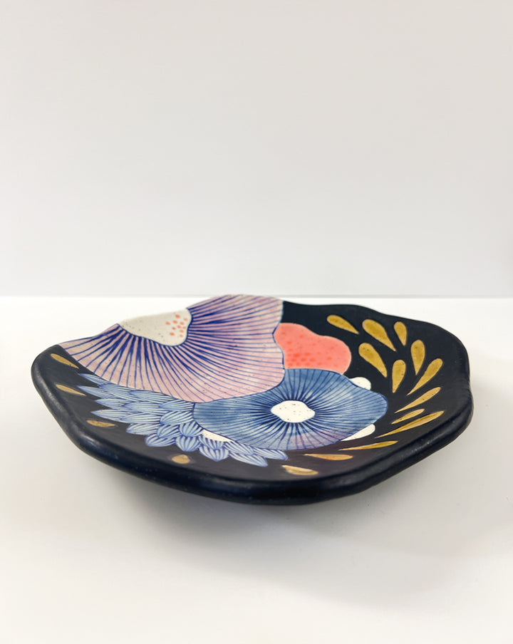 Plate 38 - 8-inch Curved Plate / Decorative Dish - Black with Floral Burst