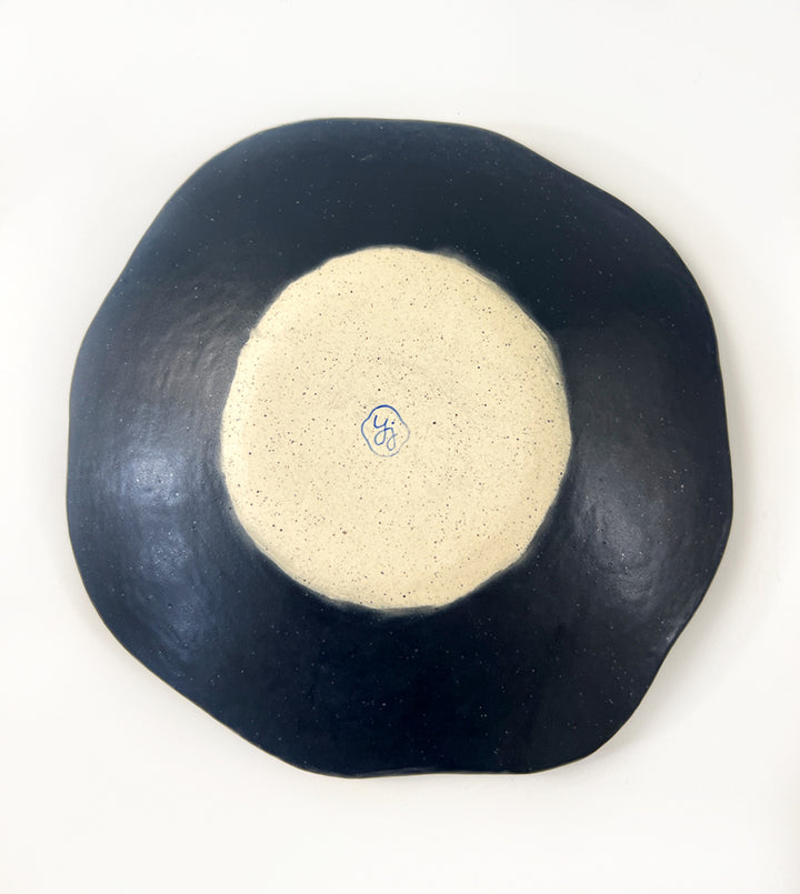This stoneware plate is handmade and the glazes were brushed by hand using food-safe glazes. It's slab built, cut to form and drape-molded. There is no foot ring on this plate but the bottom is flat and smooth.
